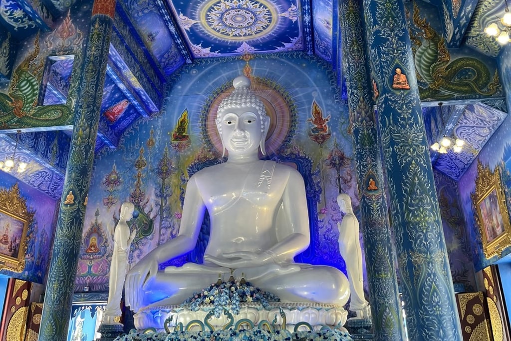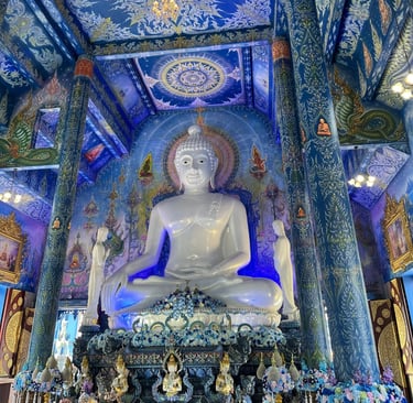 Este templo é uma obra relativamente nova, projetada por um artista local que foi aprendiz do criador do Templo Branco. E essa influência é visível na riqueza dos detalhes e na abordagem artística, mas com uma liberdade criativa que o torna singular. A arquitetura é uma fusão de valores budistas tradicionais com um design contemporâneo e arrojado. É como se a história e o futuro se encontrassem em uma sinfonia de azul e ouro.