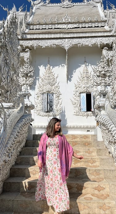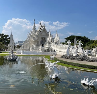 Ao se aproximar do Wat Rong Khun, a primeira coisa que te atinge é a sua brancura imaculada, que contrasta dramaticamente com o céu azul. A cor branca, adornada com milhares de pequenos pedaços de espelho, simboliza a pureza de Buda, enquanto os espelhos representam a sabedoria de Buda que "brilha em todo o universo". É uma visão de tirar o fôlego, quase etérea, que parece flutuar sobre um lago de carpas.