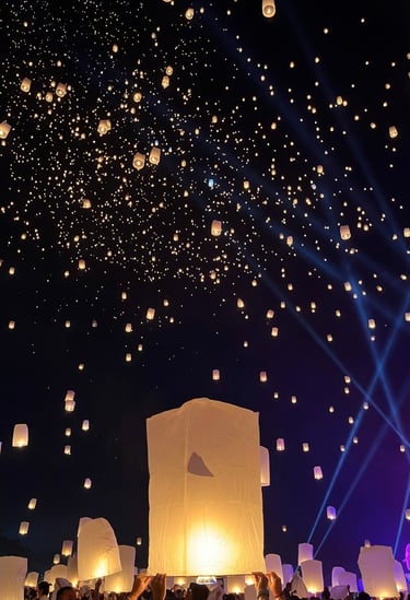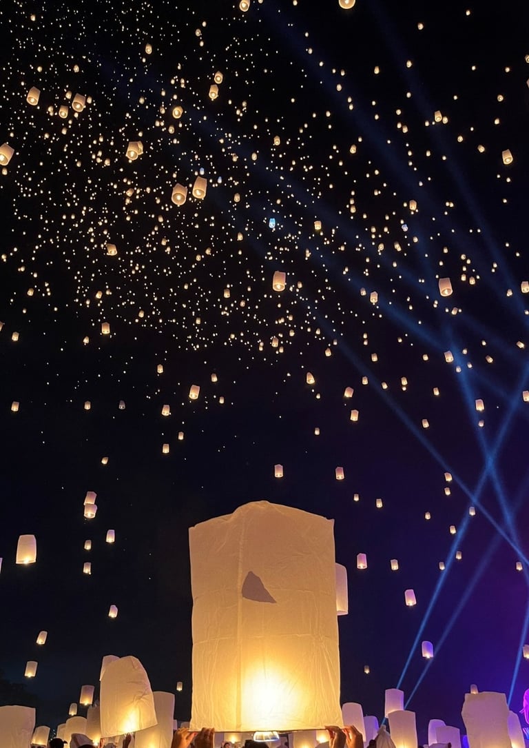 Atmosfera: É uma experiência muito mais organizada, controlada e cerimonial. Os eventos geralmente incluem apresentações culturais, música tradicional, meditação guiada por monges e um jantar ou acesso a barracas de comida Lanna. O clímax é o lançamento sincronizado de milhares de lanternas.