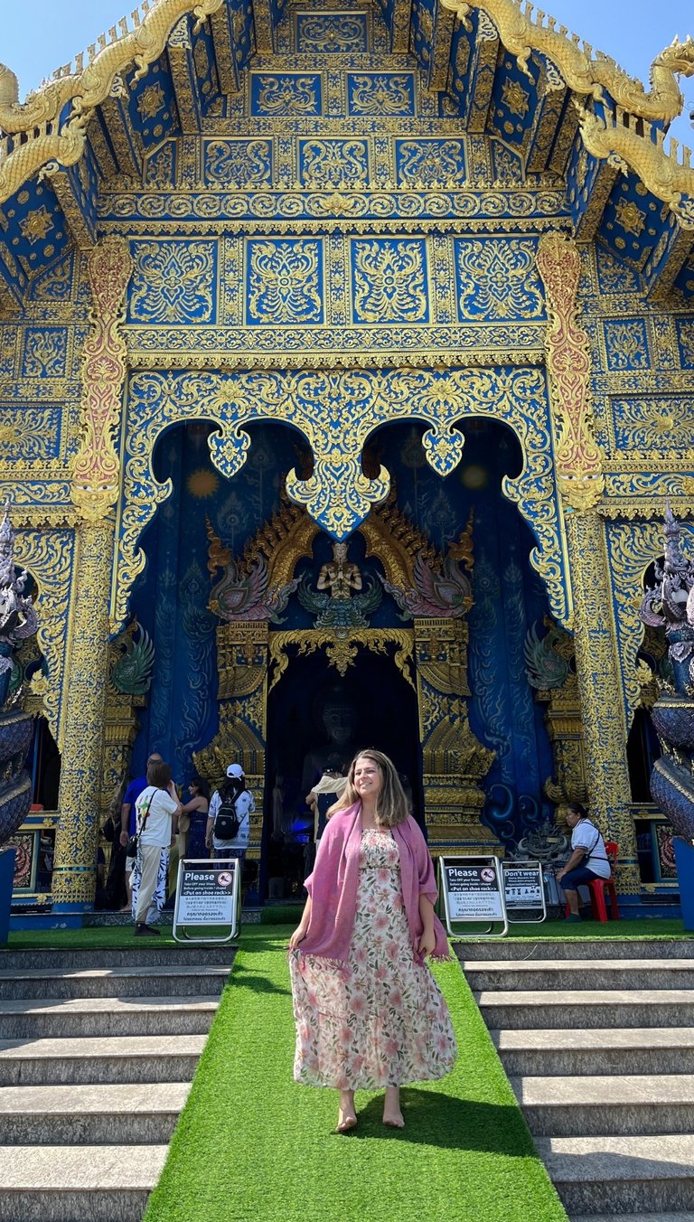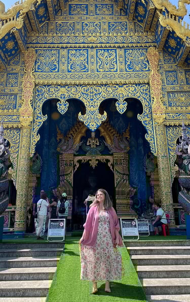 Nós conhecemos três templos, o primeiro que visitamos foi o é o Wat Rong Suea Ten: O Templo do Tigre Dançarino, no caso o da foto acima. O nome "Wat Rong Suea Ten" significa "Templo do Tigre Dançarino", e a lenda local diz que o local era um habitat de tigres que pulavam sobre o rio. Mas o que realmente dança aqui são as cores! Ao chegar, a primeira coisa que te atinge é o azul intenso, quase elétrico, que cobre todo o templo. É um azul safira, adornado com detalhes dourados que brilham sob o sol tailandês, criando um contraste deslumbrante.