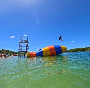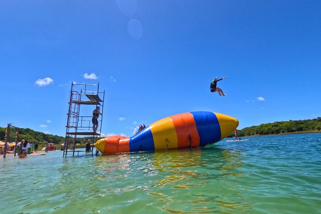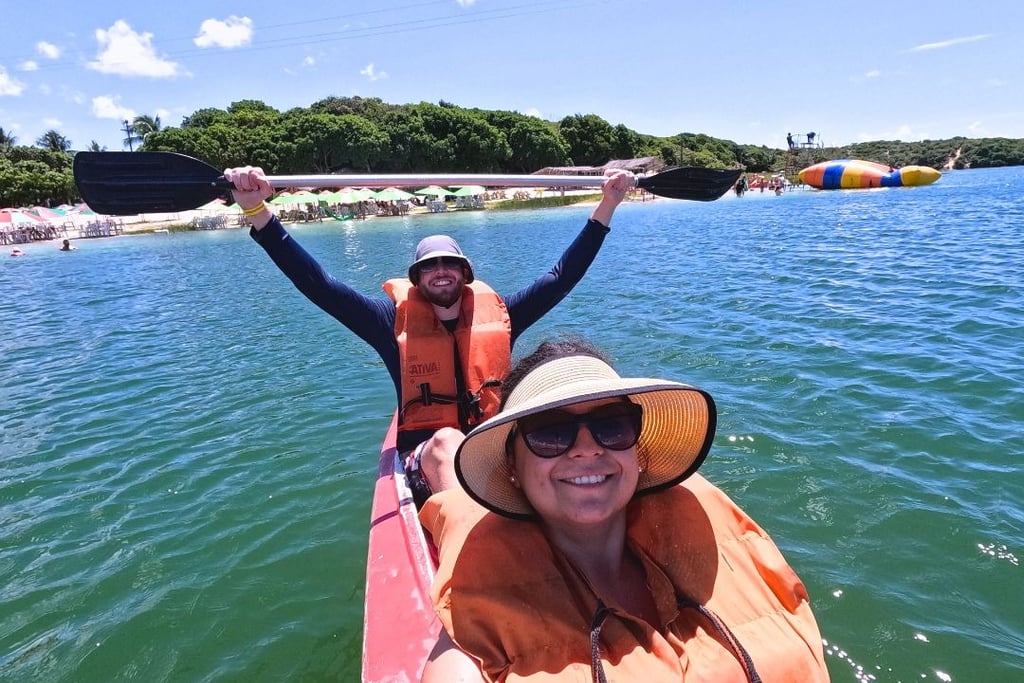 E logo após, chegamos na Lagoa de Alcaçuz, entre todos os pontos turísticos, este foi melhor com certeza, pois bastava pagar um valor de 20 reais para o day use, consumação à parte, que todas as atividades do local poderiam ser utilizadas, dentre elas havia Caiaque, Stand-up, pedalinho, redes beira água para descansar, mesa com guarda-sol e a famosa boia americana para ser arremessado. (Aquele lá no alto sou eu).